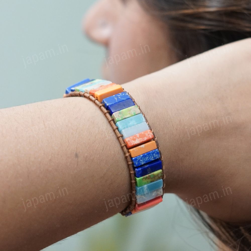 Handcrafted with precision and purpose, this 7 Chakra Micro Tile Band is designed to bring vibrant balance to your energy while showcasing a unique arrangement of natural stones that adds a touch of color to your everyday style. Each of the seven natural stones represents a distinct energy center, helping you realign your mind, body, and soul.