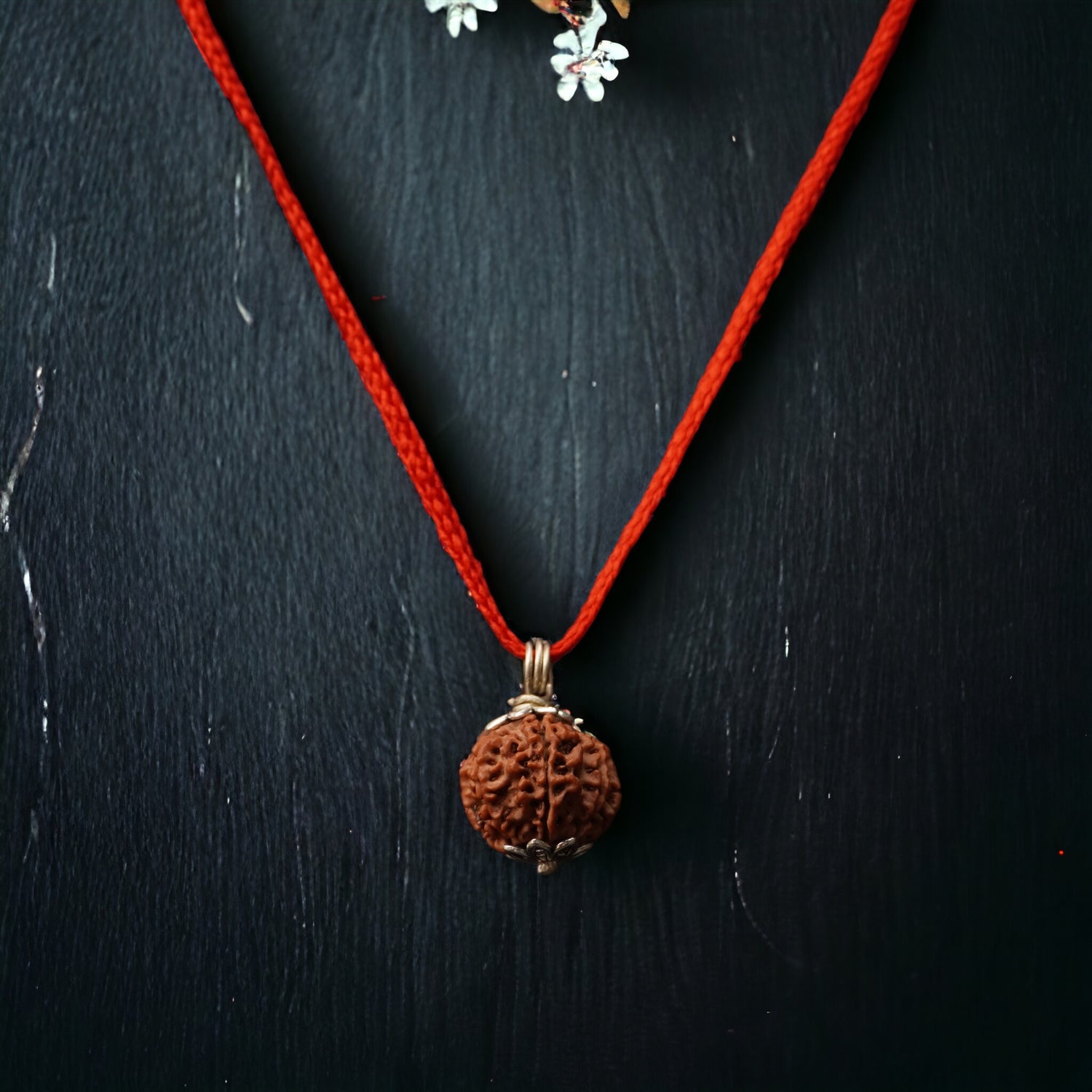 The single bead comes with silver capping and a red string (dhaaga) for wearing around the neck.