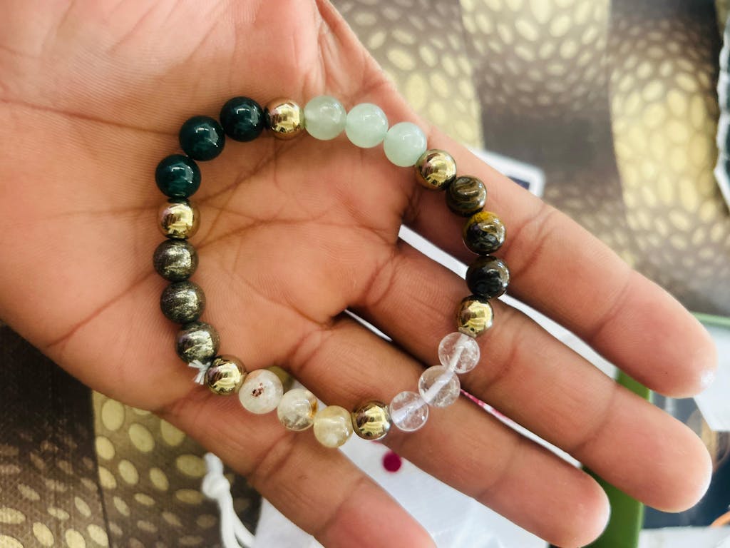 Bring wealth and harmony together with Our Dhanlabh Band with Pyrite, Tiger Eye, Citrine, Aventurine, Sphatik & Jade Beads.