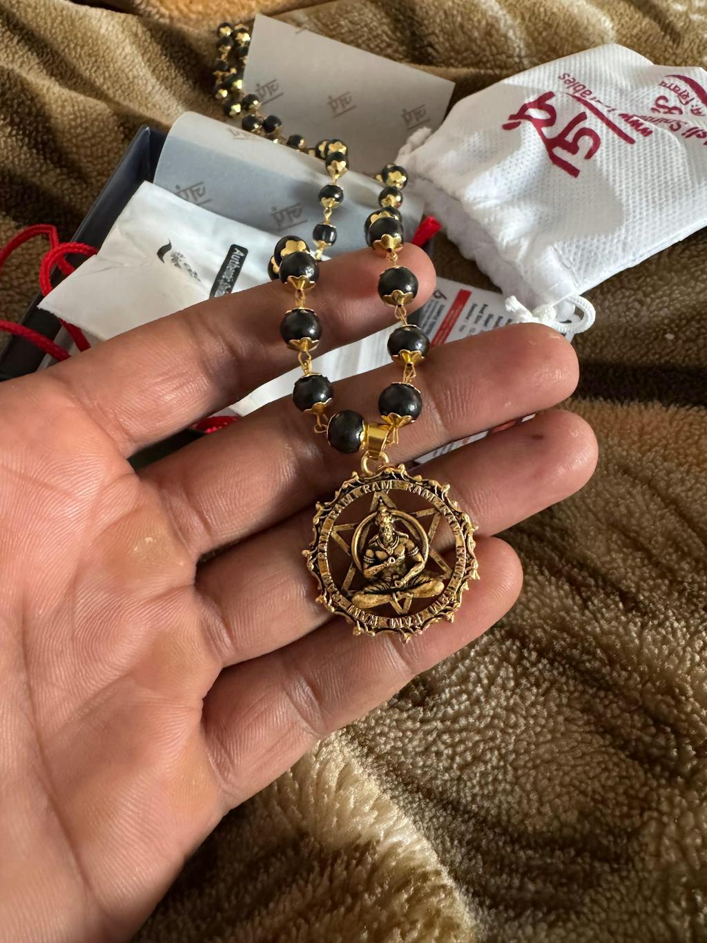 Handcrafted with authentic Karungali beads and adorned with a striking Hanuman Pendant. It features Lord Hanuman’s divine figure at the center, while the sacred Ram Ram inscription beautifully surrounds the border. Karungali wood is known for dispelling negative energies while Lord Hanuman embodies fearlessness, loyalty, and divine strength.