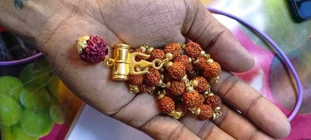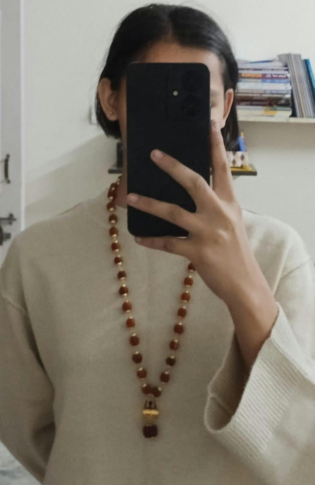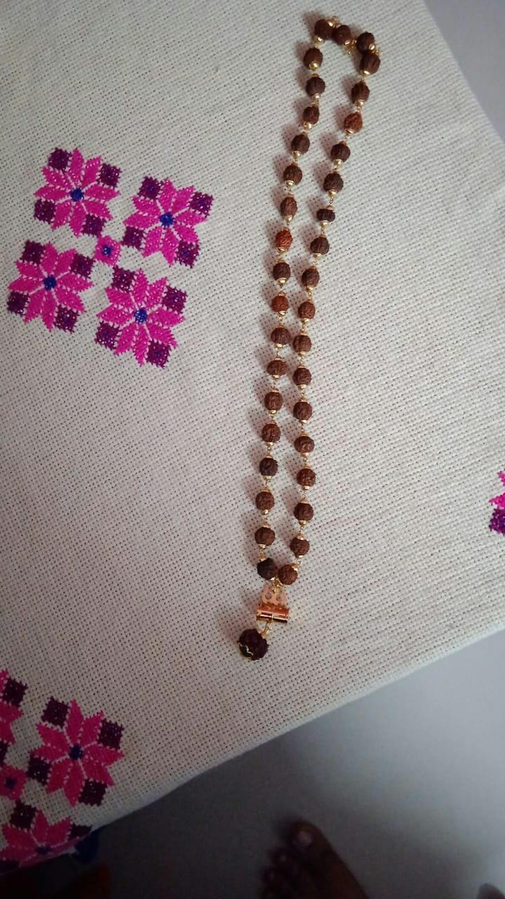 Genuine 5 Mukhi Rudraksha Trishool mala with Gold plating.