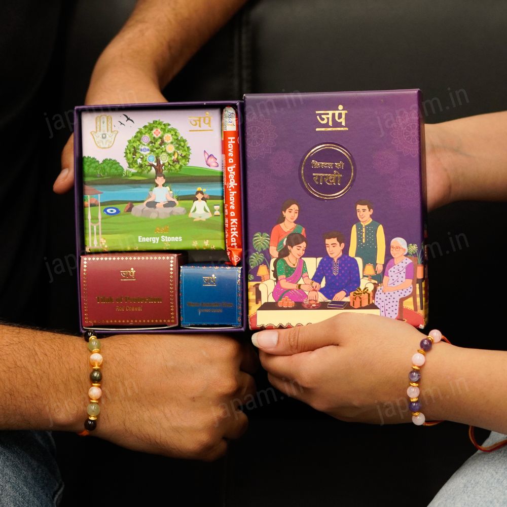 Crafted with powerful stones like Pyrite, Citrine, Tiger Eye, and Aventurine, this rakhi attracts wealth, confidence, and positivity – a symbol of prosperity your brother will carry with him long after the festival.