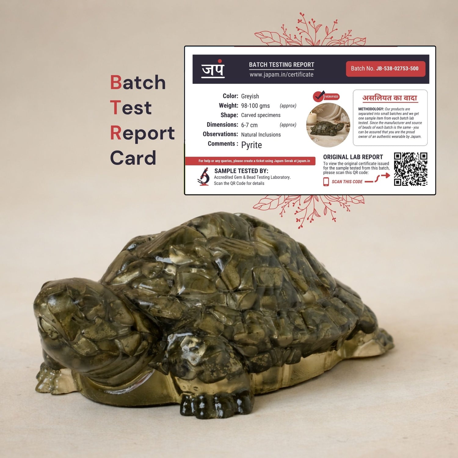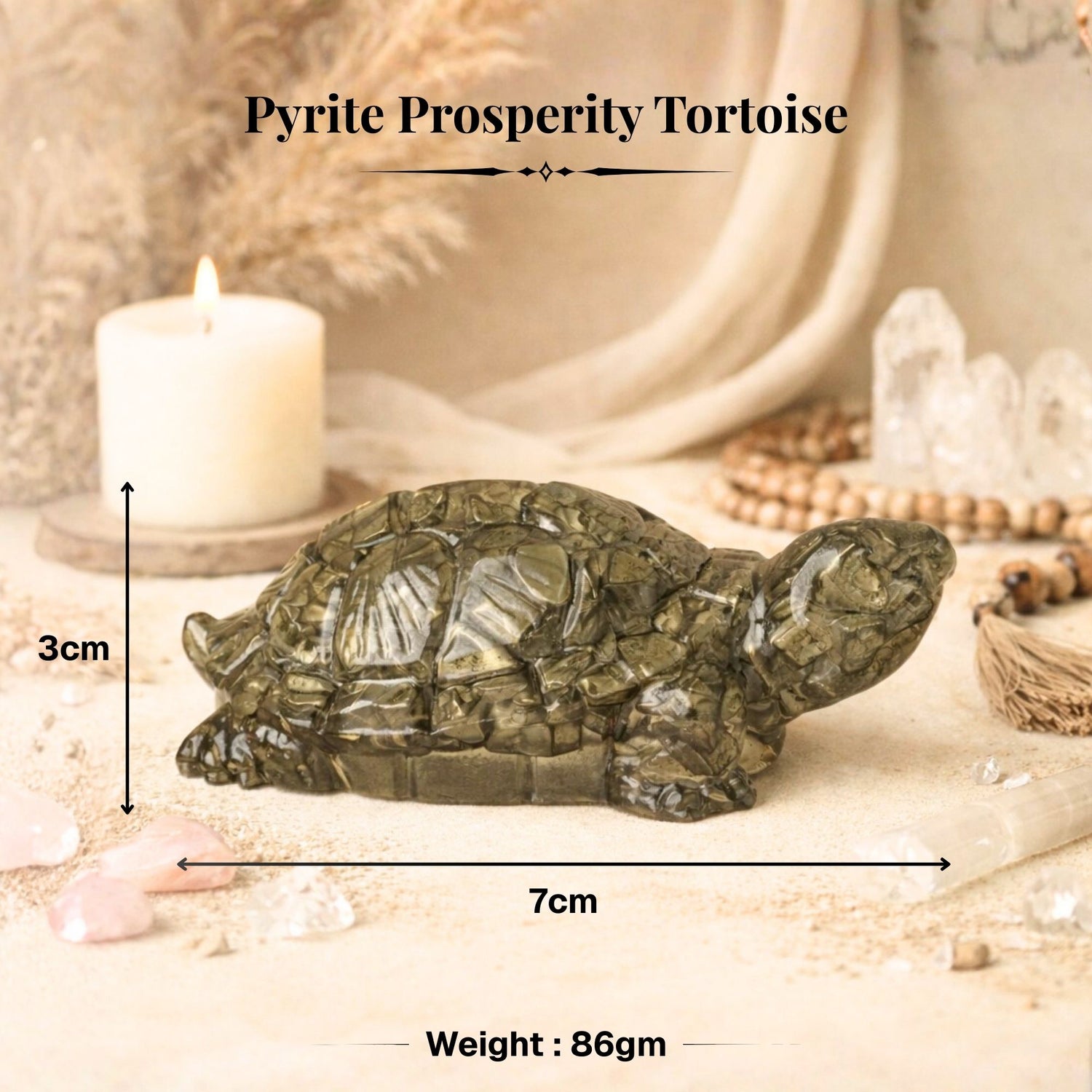 The Pyrite Prosperity Tortoise is crafted using powerful natural Pyrite stones, known for attracting wealth, and protecting against negative energy. Combined with the sacred symbolism of the tortoise (Kachhua) a sign of stability, and steady growth.