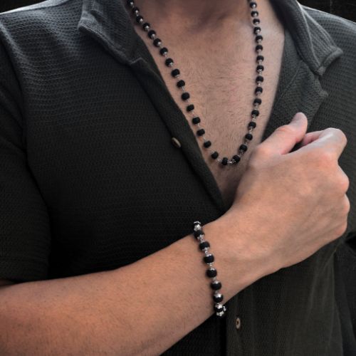 Crafted from genuine Karungali Beads and adorned with exquisite silver plating, this bracelet exudes a natural, earthy charm. Known for its grounding properties, Karungali is believed to enhance inner peace, strengthen intuition and promote a sense of connection to nature.